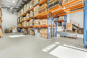 Air conditioned warehouse with racking.